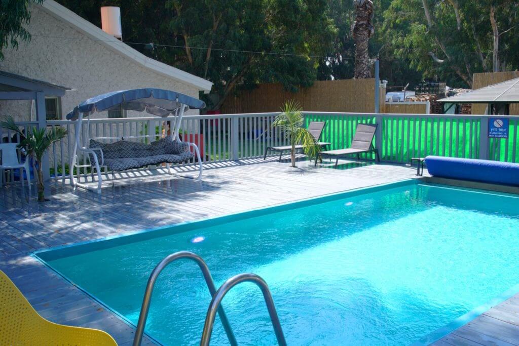 למתחם חצר עטופה בירוק הכוללת מדשאה רחבת ידיים ועצים מצלים, בריכה מגודרת (המחוממת בחורף), מיטות שיזוף, נדנדות, פינות ישיבה, ג'קוזי מקורה, מטבח חוץ מוצל הכולל מקרר, עמדת BBQ, משטח עבודה וכיור, פינת אוכל ומתנפחים לילדים בעונה.