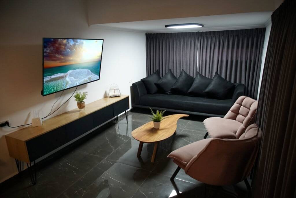 - סלון עם מערכת ישיבה וטלוויזיה בחיבור ערוצים