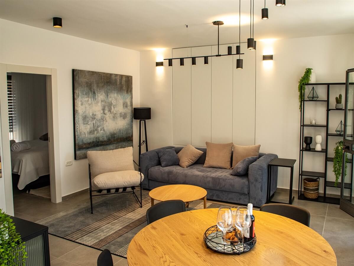 - סלון מעוצב עם ספה נפתחת, טלוויזיה בחיבור ליס ושולחן אוכל עגול