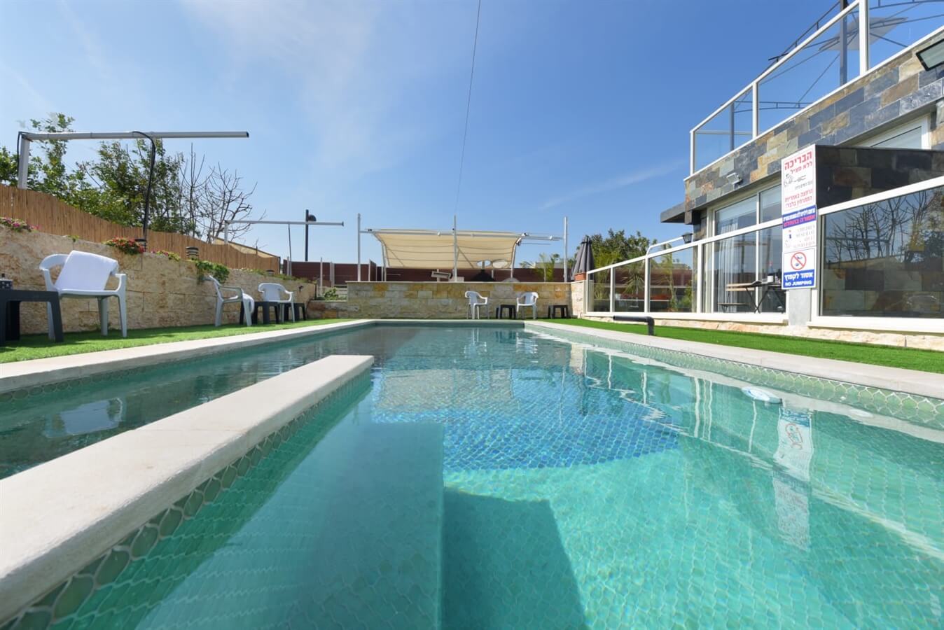 בנויה מאבן, מגודרת לבטיחות ומחוממת בעונת החורףמיטות שיזוף, ריהוט גן, מדשאה ירוקה ותאורת לילה