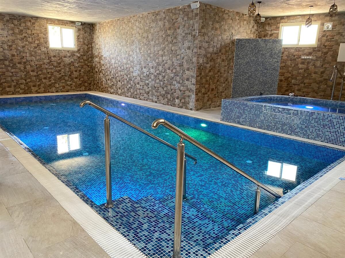 בריכה שמחוממת בחורף, ג'קוזי ספא וסאונה במבנה סגור ובטיחותי עם כסאות שיזוף.