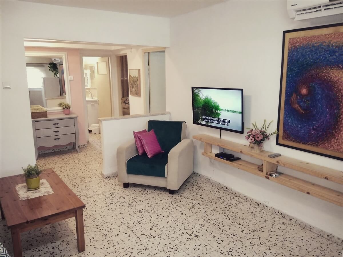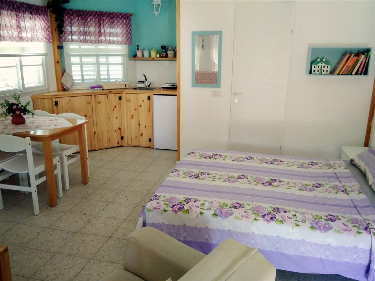 יחידה זוגית משופצת עם חלל אחד ובו סלון, מיטה זוגית נעימה, פינת ישיבה, WIFI, יציאה למרפסת פרטית, טלוויזיה בחיבור לערוצי לווין, מטבח מאובזר במיקרו, מקרר, פלטה, גז, כלי אוכל, סירים, פלטת שבת ומיחם.