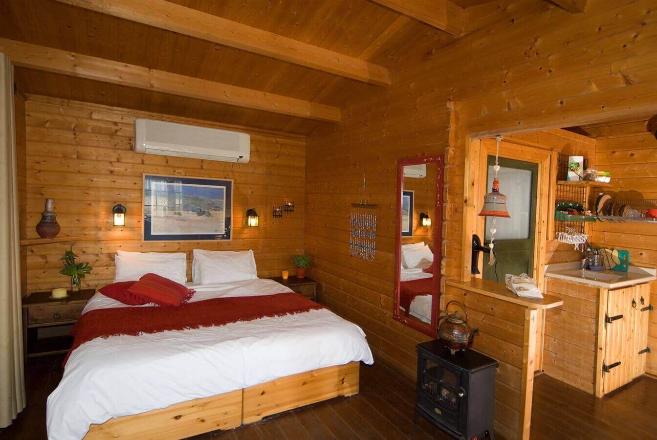 מיטה זוגית גדולה ורחבה, מצעים נעימים. פינת קפה ותה, ג'קוזי עם קצף מיוחד, חלוקים לבנים ומגבות, מיזוג אוויר לימים חמים וקמין חשמלי לימי החורף. טלוויזיה lcd בלווין ונגן dvd. פינת ישיבה נעימה ומטבחון עם מיקרוגל ומקרר. לכל בקתה, יציאה למרפסת הפונה אל הנוף והגינה עם פינות ישיבה.