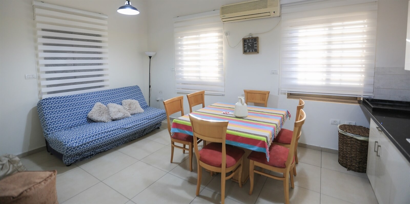 דירה מרווחת ובה חדר שינה, מטבחון, פינת אוכל, סלון הכולל ספה נפתחת, חדר רחצה מטופח ומרפסת פרטית.