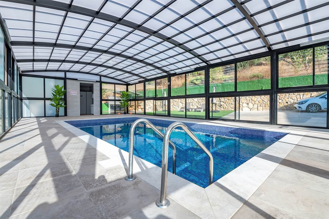 במתחם החוץ בריכה מקורה ומחוממת, פינות אוכל, פינות ישיבה ומדשאה ירוקה גדולה.