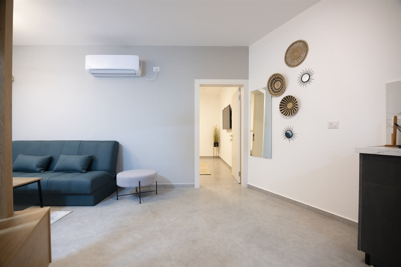 - פינת ישיבה עם ספה הנפתחת למיטה זוגית וטלוויזיה חכמה עם חיבור לערוצי כבלים ונטפליקס