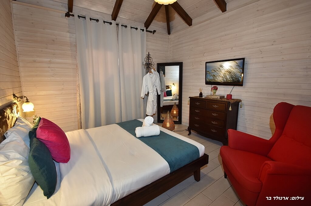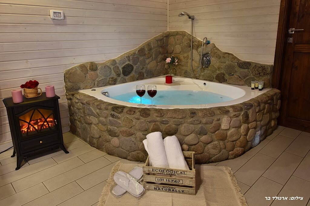 בקתת עץ נעימה ורומנטית בפרטיות מלאה בסגנון כפרי לאירוח זוגות ומשפחות עד 4 איש, בבקתה תיהנו מאבזור מלא לחופשה נוחה ומלאת חוויות עם מיטה זוגית נעימה, ג'קוזי זרמים גדול, חדר רחצה עם מקלחון, חלוקים, נעלי ספא, מגבות ותחליבי אמבט, פינת ישיבה, ספה נפתחת, פינת אוכל, טלוויזיה בחיבור לערוצי לוויין, מערכת קולנוע ביתית, מיזוג אוויר, WIFI חופשי, לול לפעוטות ומזרון נוסף ומטבחון מאובזרעם מקרר, קומקום חשמלי, מיקרו, מכונת אספרסו ופינת קפה.