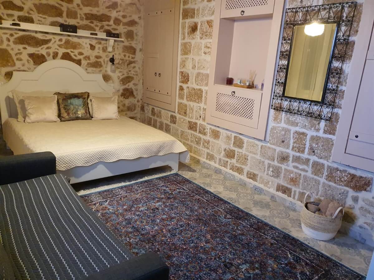 אירוח קסום לזוגות ביחידת אירוח עם אבנים עתיקות על הקירות, מיטה זוגית רחבהה, ספת ישיבה, שידות אחסון ומסך טלוויזיה המחובר לכבלים