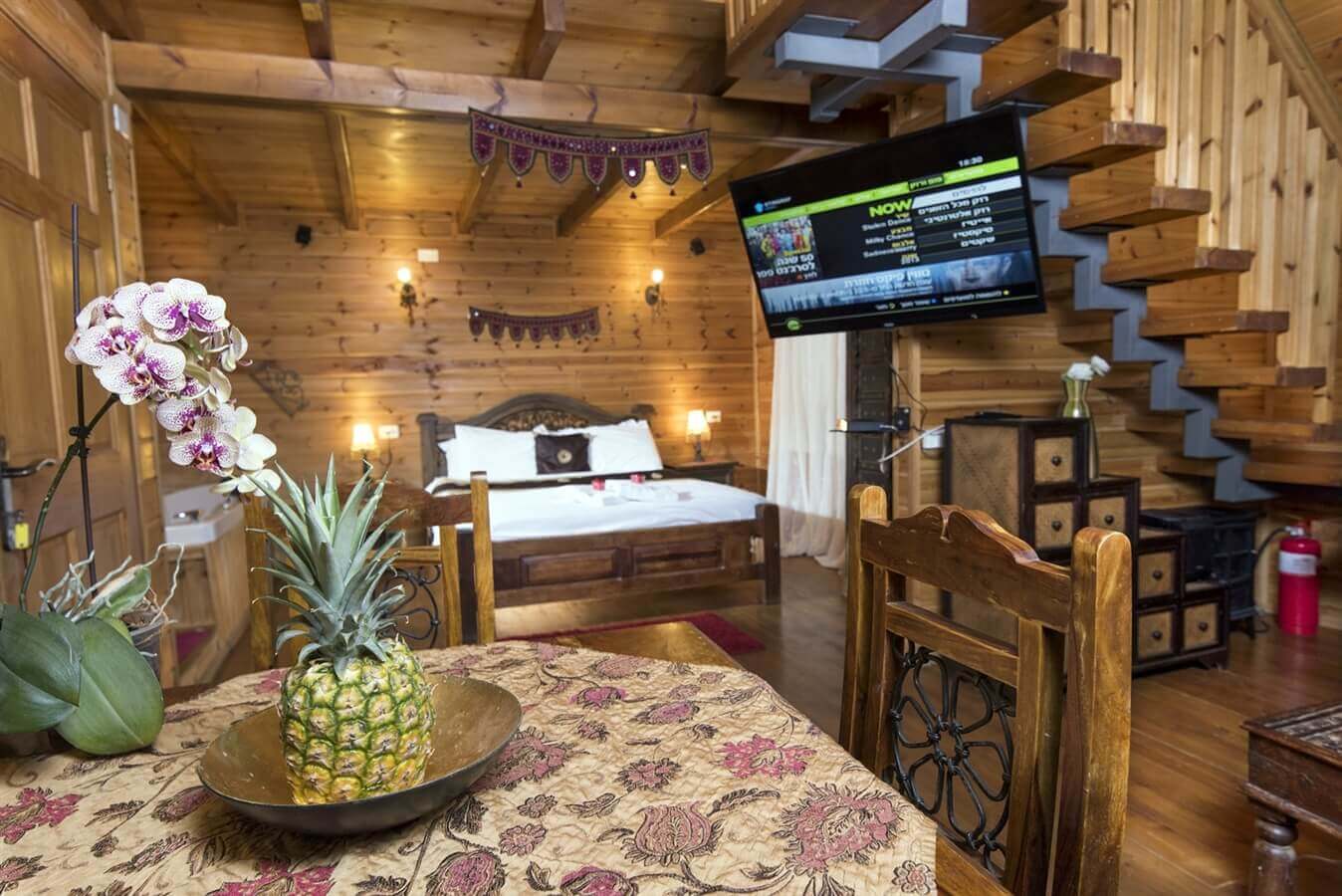 בקתה מיוחדת המעוצבת בסגנון אינדונזי ומתאימה לאירוח זוגות ומשפחות עד 6 נפשות וכוללת: