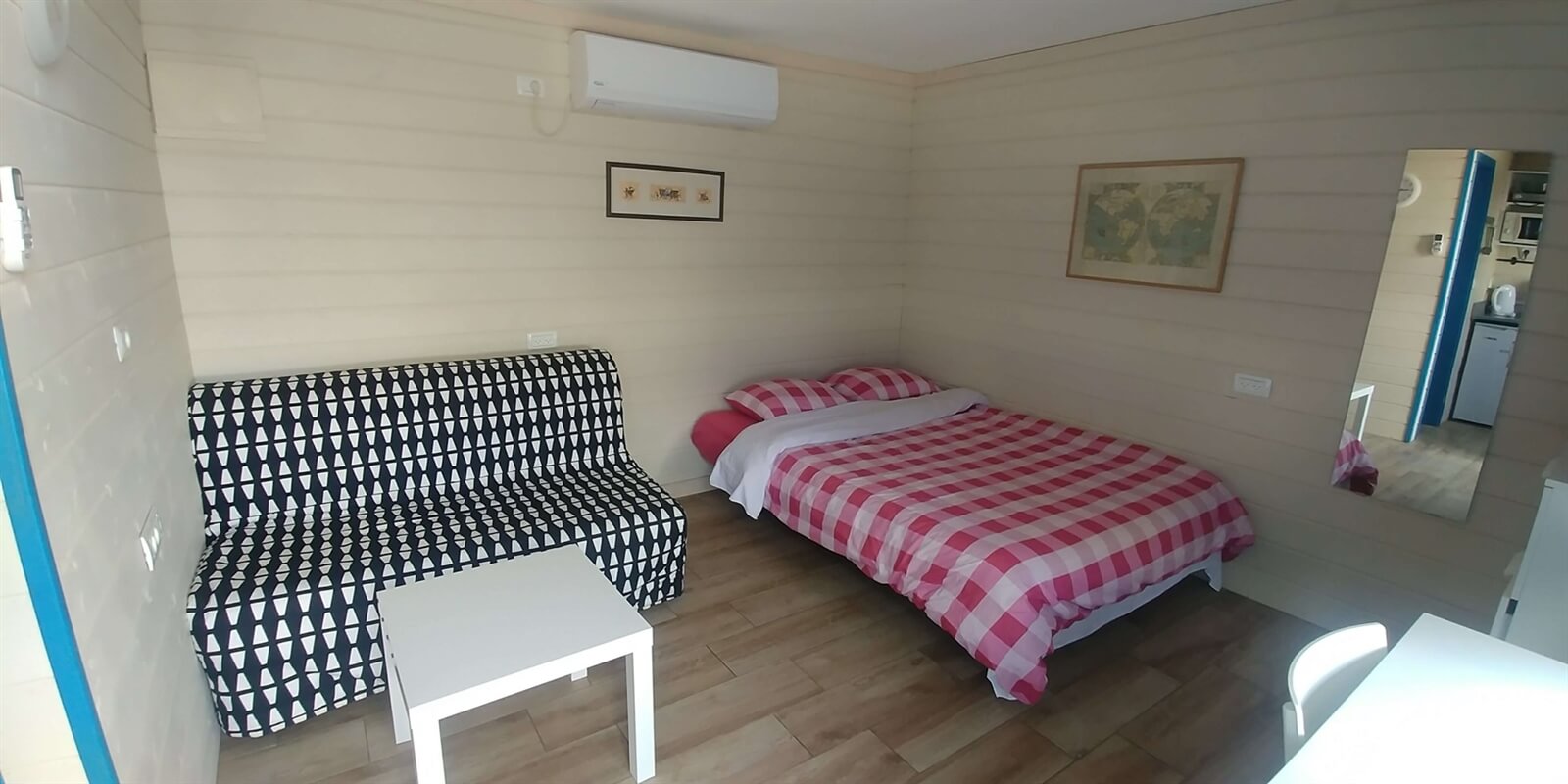 - סטודיו - בקתה בגודל 25 מ"ר, מיועדת למשפחות עד 4 אנשים ומכילה מיטה זוגית מרווחת, ספה הנפתחת למיטה נוספת, מטבחון מאובזר, פינת אוכל, חדר רחצה, מסך טלוויזיה בכבלים, אינטרנט אלחוטי, מרפסת נוף ופינת ישיבה בחצר.
