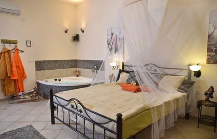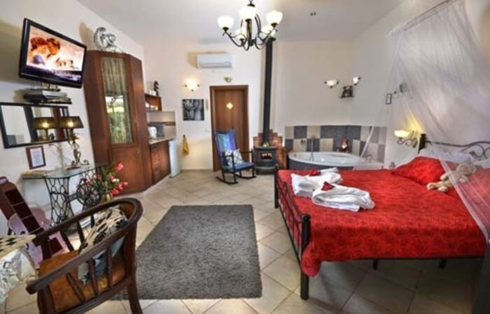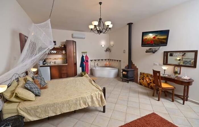 סוויטה מרווחת ואלגנטית המאובזרת עד לרמת הפרטים הקטנים וכוללת מיטה זוגית מרווחת, ג'קוזי זוגי מפנק, פינת ישיבה נעימה, אח עצים לימי החורף הקרירים, מטבחון מאובזר ובו פינת קפה, מיקרוגל, מסך lcd, מכונת קפה איכותית ומקרר.