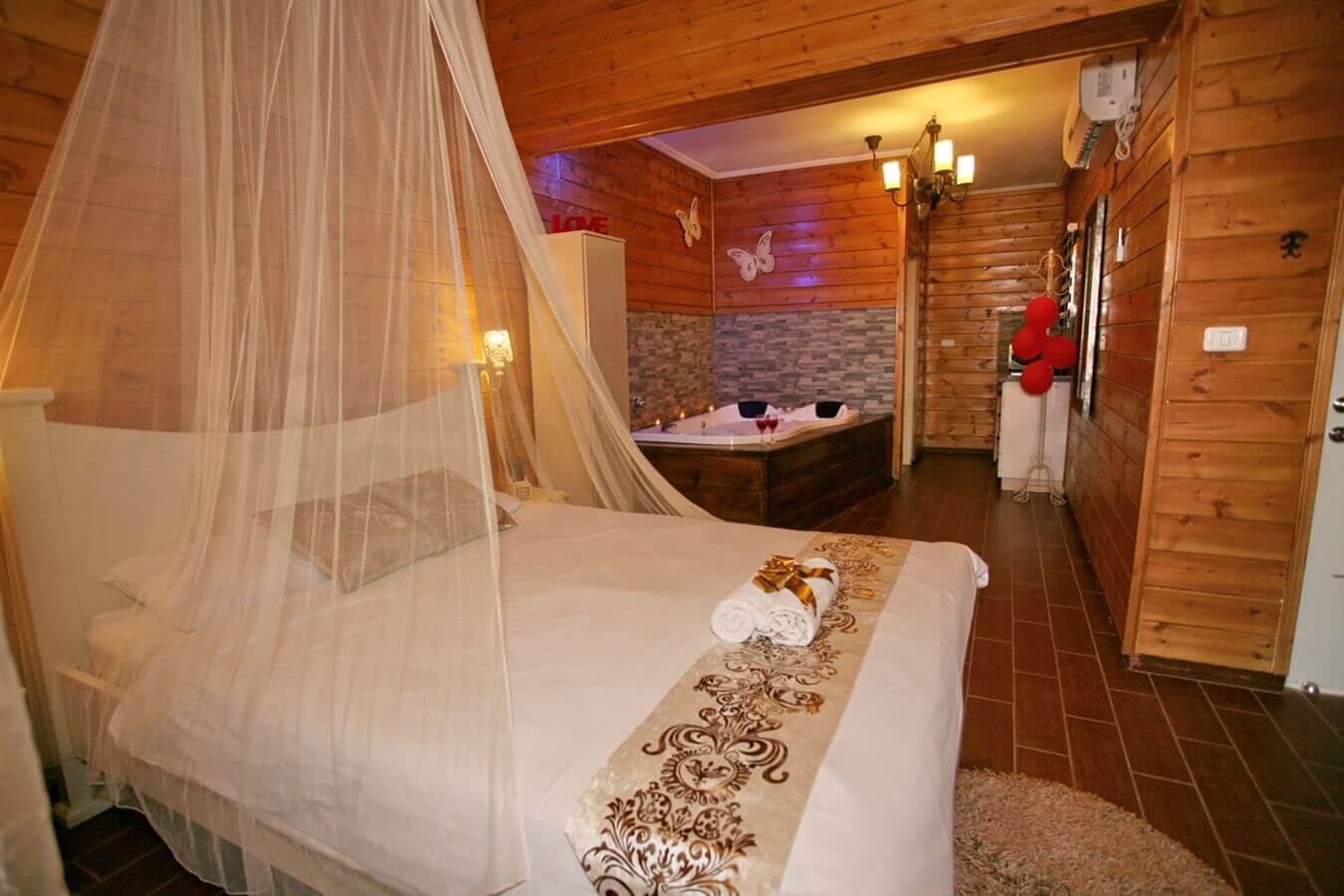 בקתת העץ של אהבה במרומים מעוצבת בסגנון כפרי ועם אלמנטים רומנטית במיוחד, לחופשה מלאת אהבה. הבקתה כוללת מיטה זוגית מרווחת ונעימה עם מזרן אורטופדי, ג'קוזי זוגי רומנטי מוקף נרות, פינת ישיבה, טלוויזיית lcd עם חיבור לכבלים, אינטרנט אלחוטי, מיזוג אוויר, תאורת אווירה רומנטית ומטבח מאובזר המתאים גם לציבור שומר המסורת. סביב הבקתה חצר ירוקה ומטופחת עם יציאה למרפסת דק ענקית, פינות ישיבה ונדנדה. לבקתה יציאה ישירה לבריכה המחוממת.