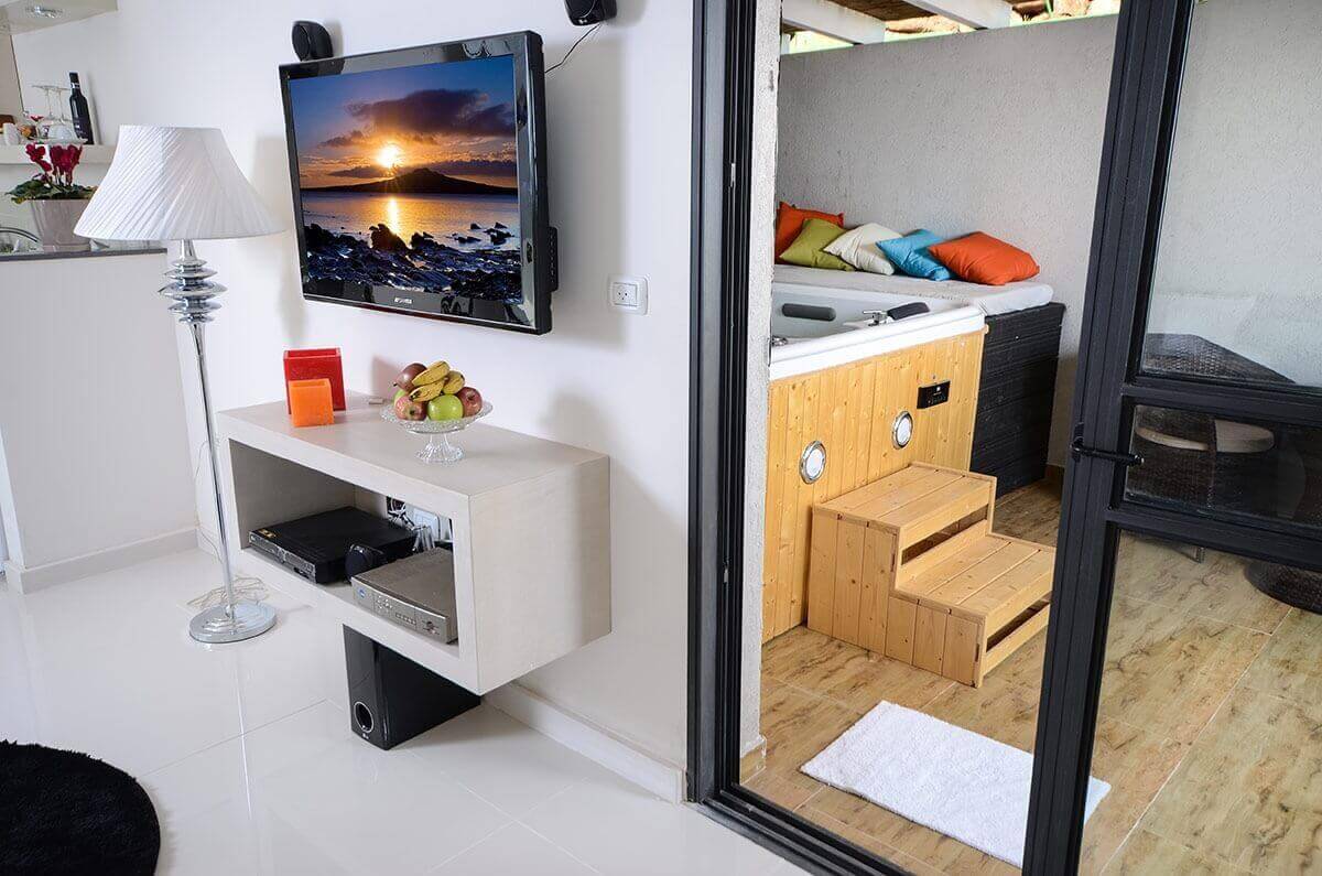 הסוויטה כוללת מיטה זוגית ענקית ויוקרתית מעור 2 * 2.10 מ', פינת ישיבה סלונית עם כורסאות מעוצבות, טלוויזיית lcd מחוברת ל- yes ומערכת קולנוע ביתית + אינטרנט מובנה ומקלדת לטלוויזיה