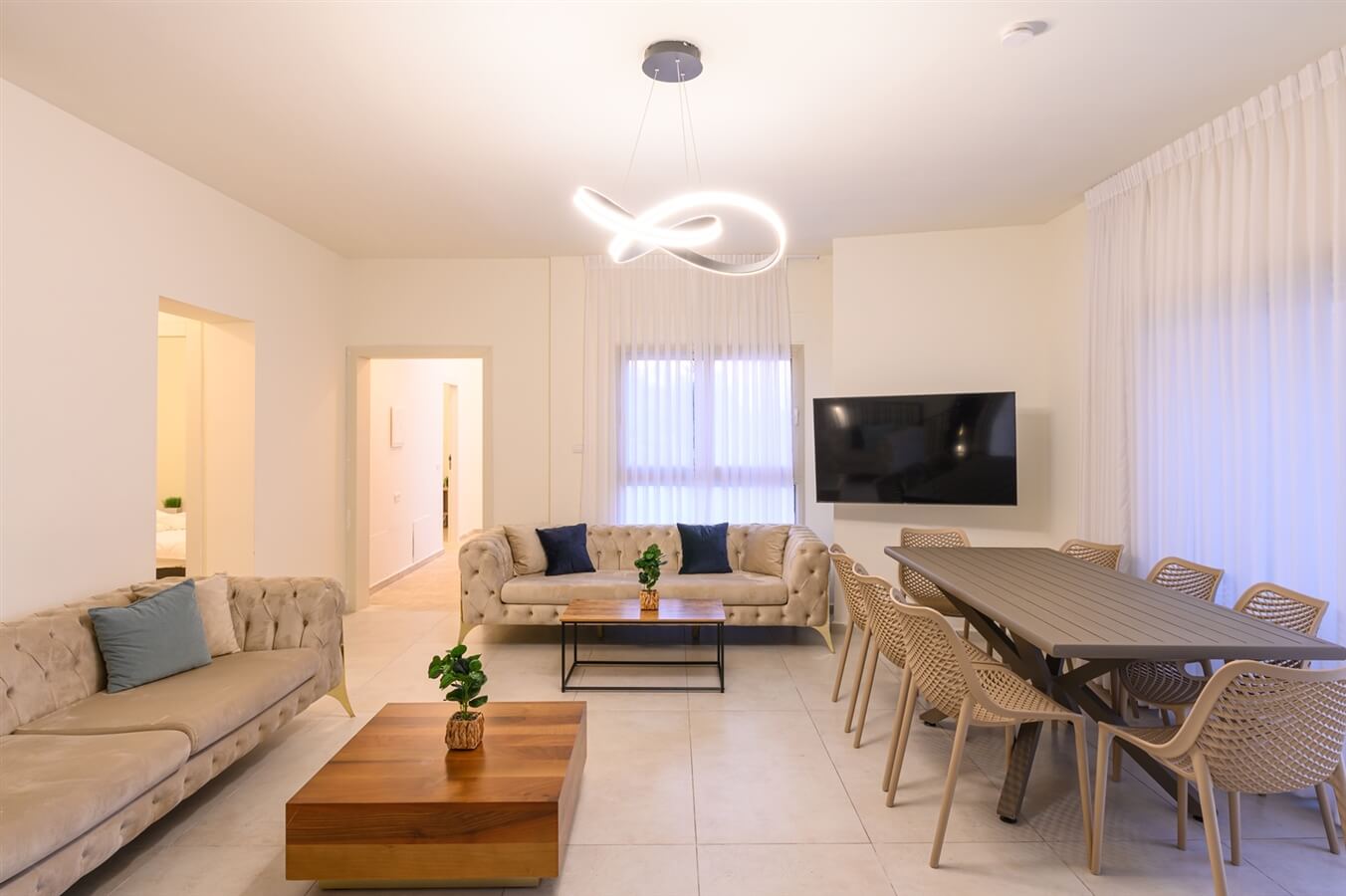 הסלון הגדול של הוילה מציע פינת ישיבה נוחה, טלוויזיה חכמה עם גישה לנטפליקס ומרפסת רחבה המשקיפה לנוף פנורמי. מיזוג האוויר מאפשר נוחות בכל עונות השנה.