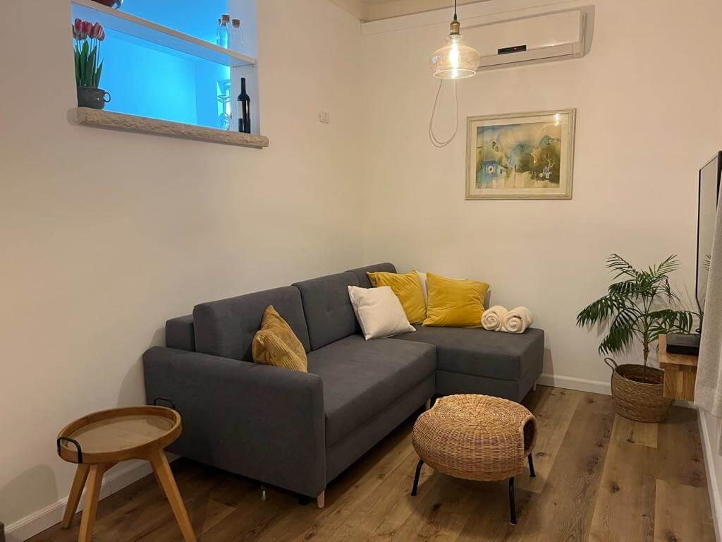 סלון פינתי עם ספה הנפתחת למיטה זוגית עם כורסא, שולחן וטלוויזיה חכמה- פינת קפה