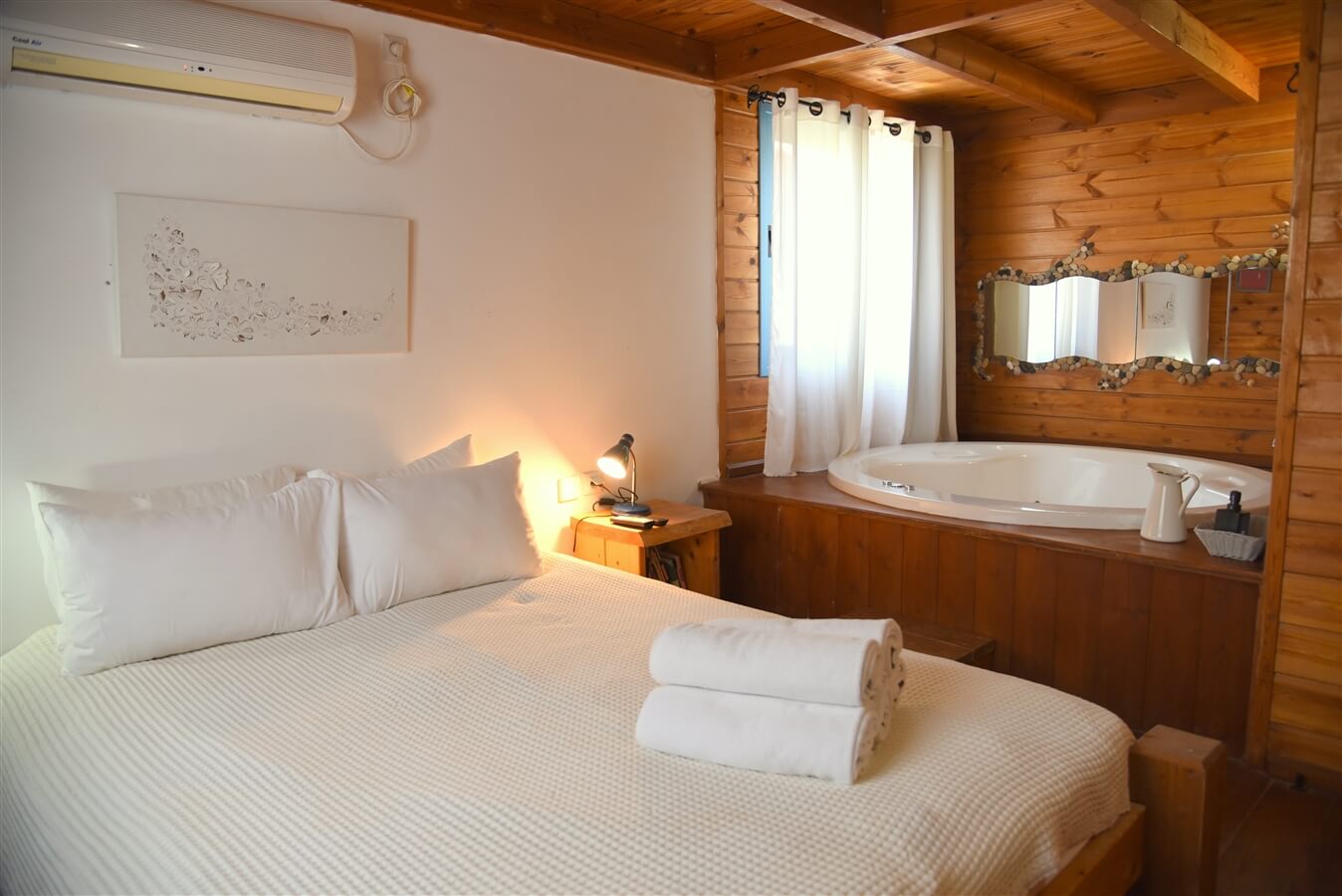 במטמון בערבה - 5 בקתות עץ חדשות הצופות אל הנוף המדברי, מאובזרות ברמה גבוהה במיוחד ובחשיבה עד הפרט האחרון להנעים את חופשתכם. בבקתה חדר שינה להורים עם ג'קוזי עגול מרווח באווירת נרות וקטורת רומנטית, מיטה רחבה עם מזרן אורתופדי ומצעי כותנה יוקרתיים, מערכת מיזוג, טלוויזיה בלוויין ו- dvd, פינת ישיבה נוחה ומטבח מאובזר היטב. בכל בקתה חצר פרטית ובה גינה ירוקה ופורחת ופינת גריל. ומרפסת פרטית להנאה מרבית. הבקתה מרווחת באופן מיוחד, המרחב העצום מאפשר אירוח ונוחות מרביים גם למשפחות עם ילדים.