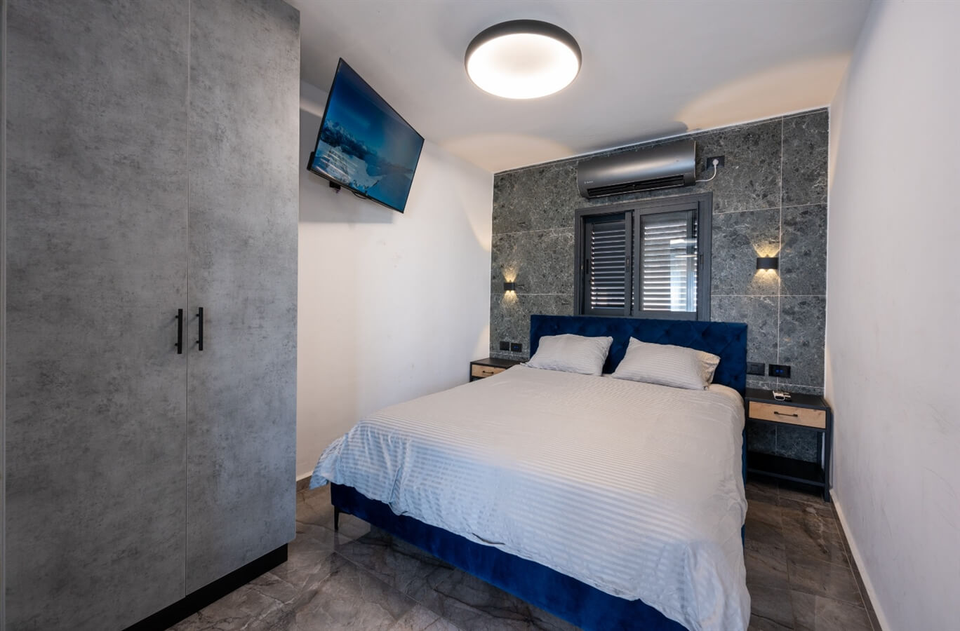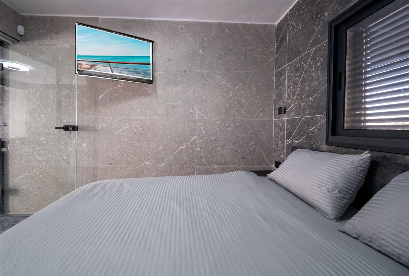 - חדר שינה עם מיטה זוגית וטלוויזיה חכמה