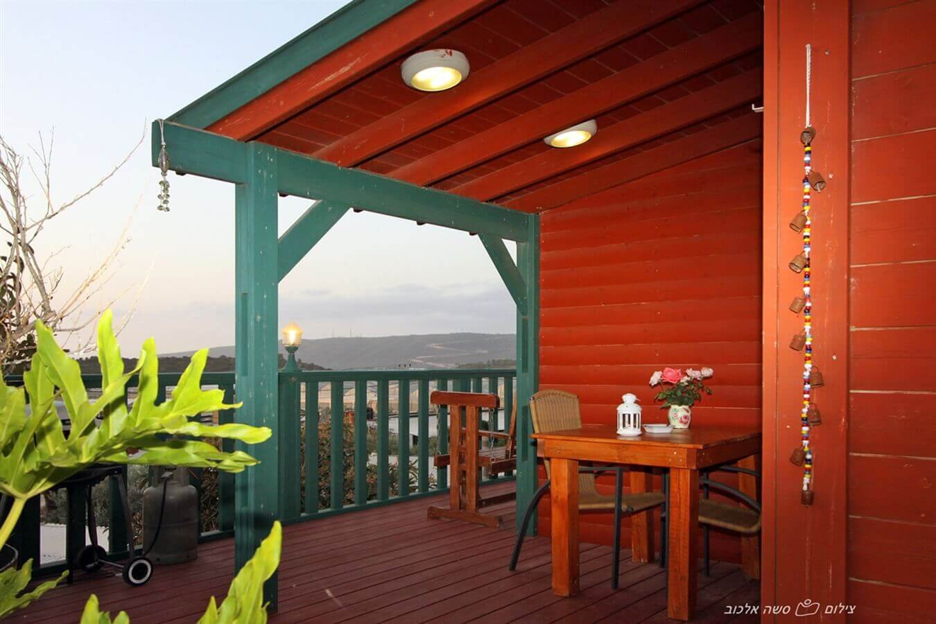 לבקתה מרפסת פרטית המשקיפה לנוף גלילי פנורמי וכוללת פינת ישיבה פסטורלית ונדנדה עץ כפרית.