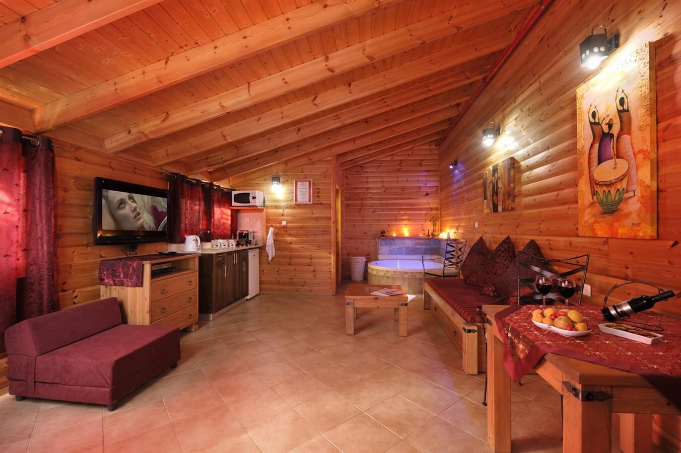 - סלון גדול הכולל: ג'קוזי, פינת ישיבה הנפתחת למיטה זוגית ואופציה להוספת מזרן נוסף, טלוויזיה + יס, מטבחון מאובזר במקרר, מיקרוגל, רומרום, כלי אוכל, פינת קפה עם מכונת אספרסו, תה, סוכר, קפה וחלב