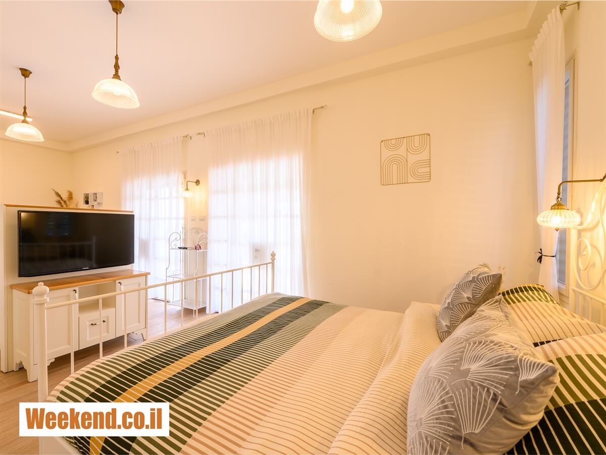 - חדר שינה עם מיטה זוגית וטלוויזיה עם חיבור לכבלים ונטפליקס
