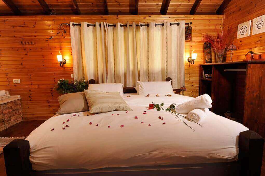בבקתה ג'קוזי מרווח ולצידו חלון פנורמי המשקיף לנוף ונרות להשלמת האווירה החמימה והנעימה. הבקתה מאובזרת בטלוויזיית lcd בחיבור לכבלים, פינת ישיבה נוחה ומטבחון עם עמדת קפה ותה, בר מים, מיקרוגל, מקרר ופלטה חשמלית.*תוכלו להזמין לחדר עיסויים מפנקים וארוחות בוקר עשירות בתוספת תשלום.