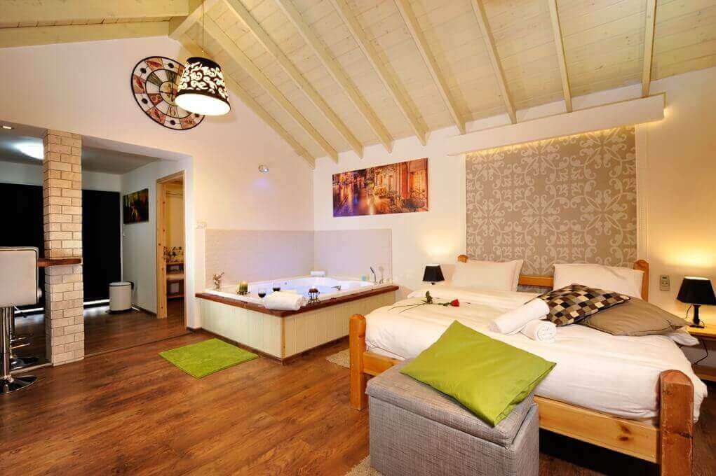 בסוויטה קמין מחמם, ג'קוזי מפנק ויציאה למרפסת פרטית. ביחידה 2 מסכי lcd עם חיבור לכבלים, שולחן אוכל מסוגנן וחדר ילדים נעים ונפרד. מטבחון הסוויטה כולל כיריים חשמליות, מיקרוגל, טוסטר, מקרר ובר מים. בחדר הרחצה המרווח יחכו לכם מגבות רכות, סבונים ותחליבי רחצה מבושמים.*ניתן להזמין היישר לסוויטה ארוחות בוקר מפנקות וטיפולי ספא מקצועיים.