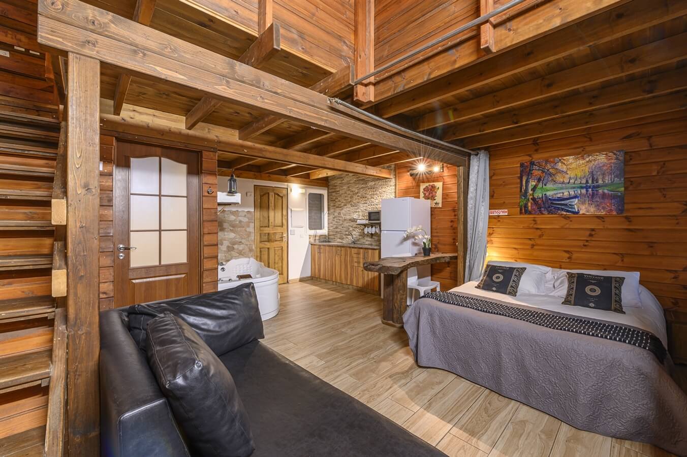 צימר מהודר ובו חדר הורים עם מיטה זוגית קינג סייז, סלון פינתי מפנק מעור אשר נפתח למיטה זוגית, מערכת מוזיקה וטלוויזית אנדרויד, מטבח מעץ מגולף מאובזר לבישול או הכנת משהו קל ושולחן אוכל. בצימר גקוזי עגול הממוקם בפינת נוף מדהימה וקומת גלריה ל-4 ילדים.