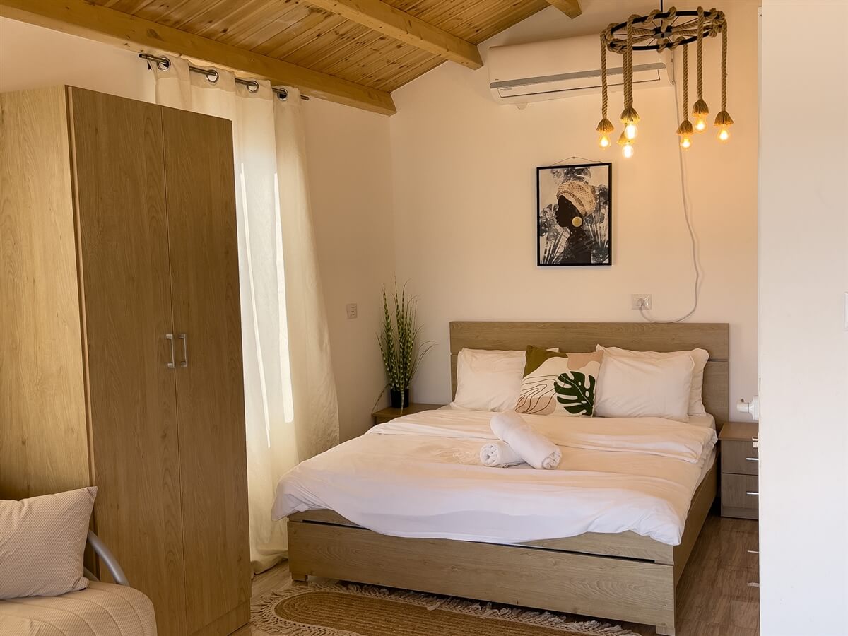 סוויטה גדולה ל- 7 איש עם 2 חדרי שינה: חדר להורים בנפרד עם מיטה מושקעת וחדר לילדים. בנוסף, חדר רחצה, מטבח מאובזר, מקרר גדול וטלוויזיה גדולה. גם לסוויטות האלו יש מרפסת פרטית עם פינת מנגל.