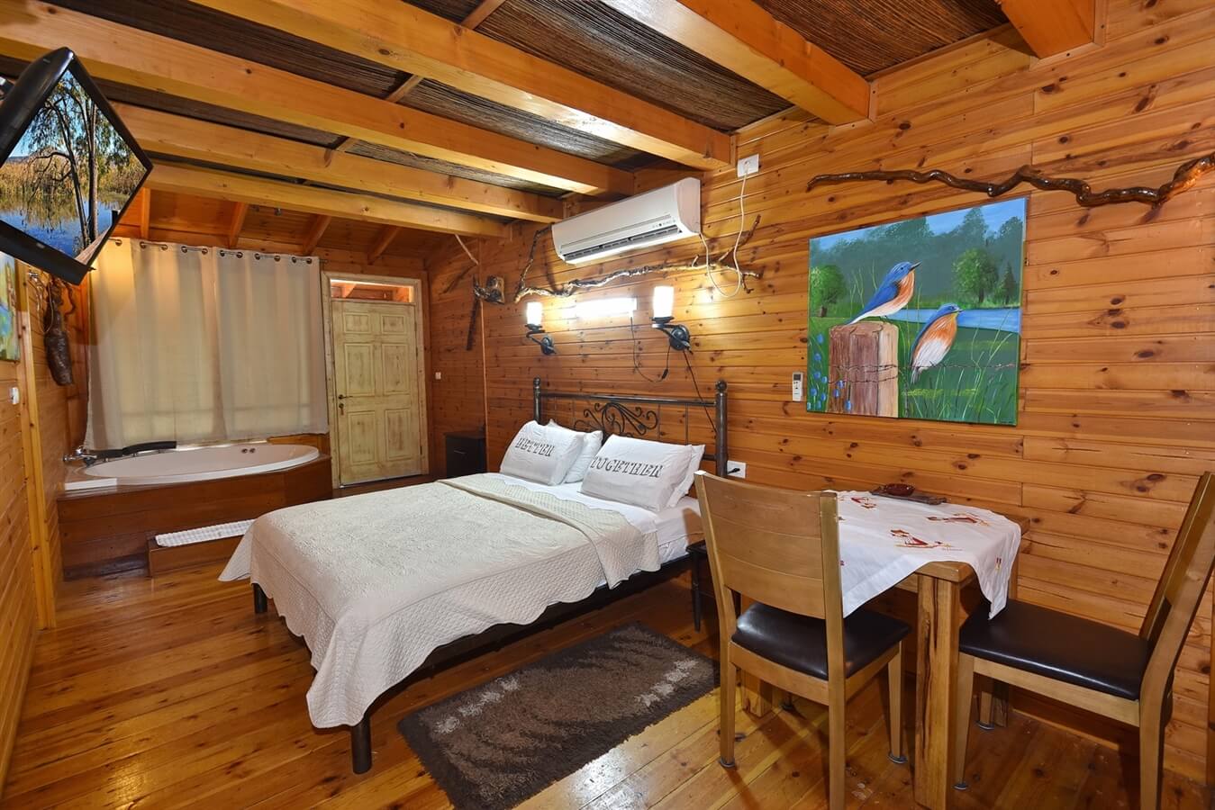 בקתת עץ נעימה ורומנטית המתאימה לזוג בה מיטה זוגית נעימה, ג'קוזי זרמים זוגי, טלוויזיה בכבלים, פינת ישיבה, שידת מראה, חדר רחצה עם מקלחון ומוצרי טואלטיקה, מטבחון מאובזר עם מקרר, מיקרו, פינת קפה וכלי אוכל ונוף לארבל ולכנרת.