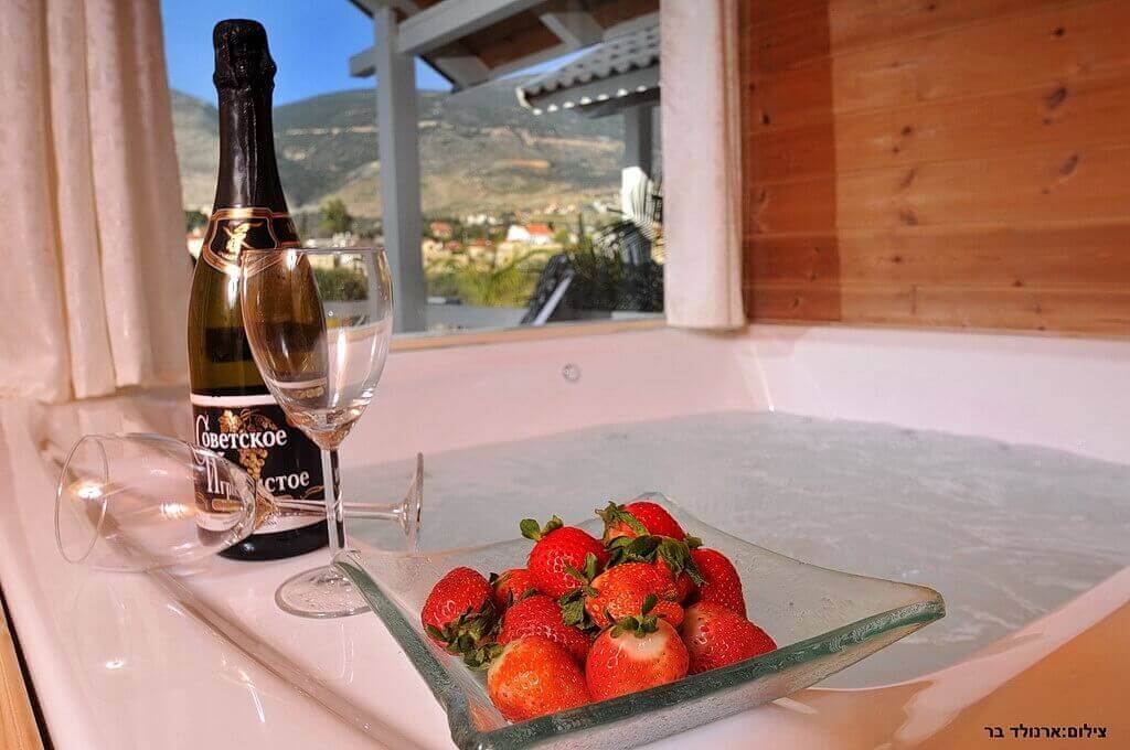 - ג'קוזי גדול ויוקרתי עם נרות. הג'קוזי פונה לחצר המתחם העשירה ונוף הגליל