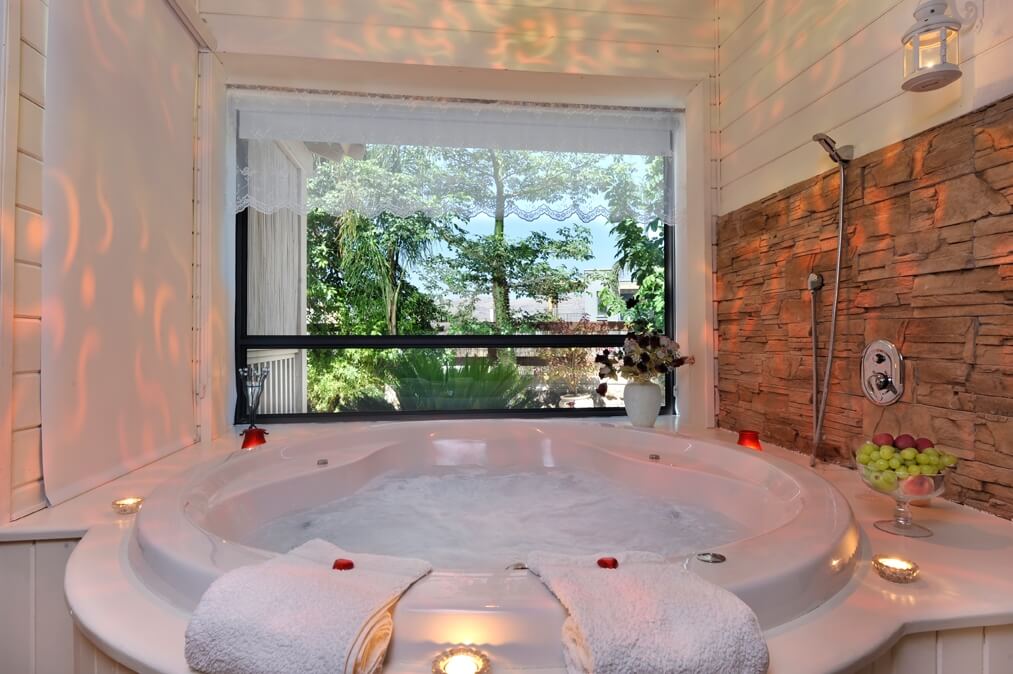 סוויטת אור מעוצבת כסטודיו על טהרת הלבן עם ג'קוזי לבן ומיטה לבנה בחלל מרווח צחור.
