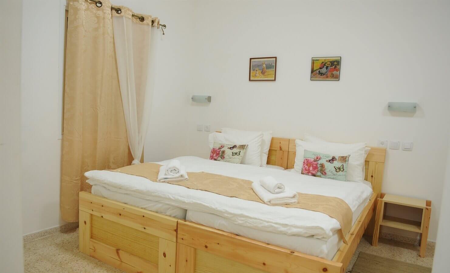 בכל חדר מיטה זוגית מעץ טבעי עם מצעי כותנה רכים, ארוניות קטנות לצד המיטה, מטבחון מאובזר במקרר, מיקרוגל, פלטת בישול וקומקום חשמלי. לרשותכם אינטרנט אלחוטי, מסך lcd עם חיבור לכבלים, מזגן, מקלחון או אמבטיה וחדר שירותים.