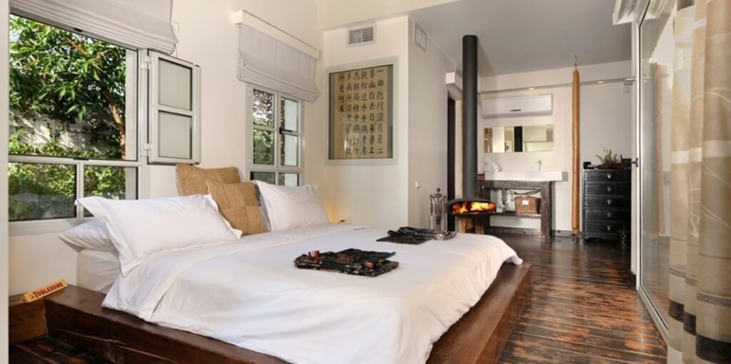 - מיטה זוגית גדולה ומפנקת במיוחד עטופה בעץ גושני ומולה טלויזיה איכותית עם ערוצי לווין שונים