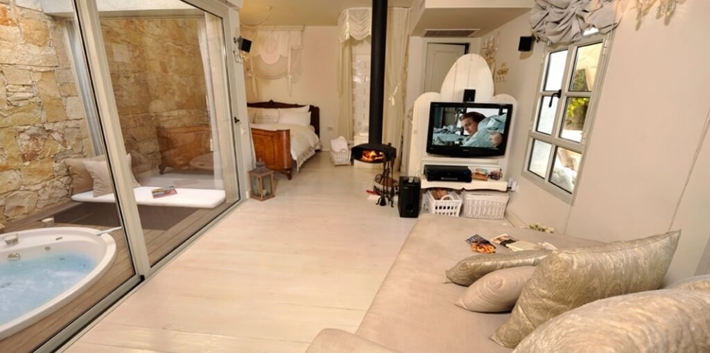 הסוויטה הפרובנסית מעוצבת בגוונים בהירים ורומנטים עם מרפסת פטיו מפנקת וג'קוזי גדול.