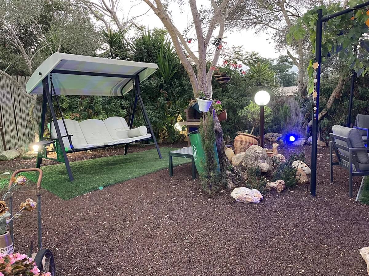 בצימר תיהנו גם מגינה פסטורלית ומקסימה עם פינות ישיבה ונדנדה, עמדת מנגל מאובזרת ובריכה מרווחת.
