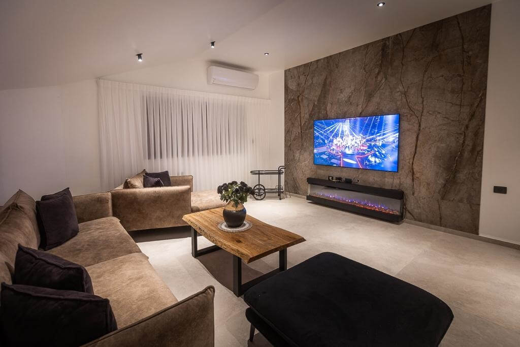 - סלון עם מערכת ישיבה וטלוויזיה חכמה בחיבור כבלים ונטפליקס