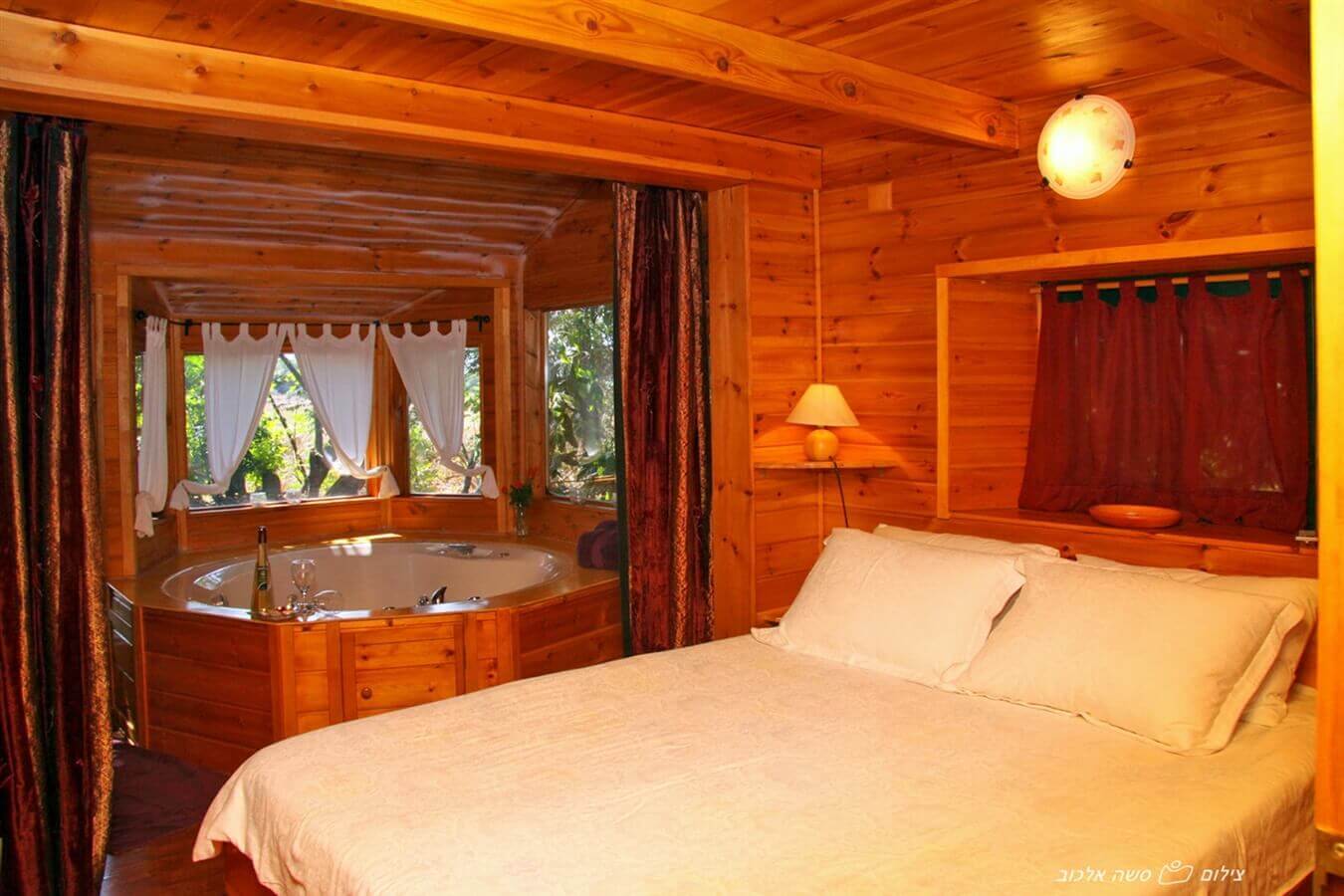 בבקתה חדר שינה מרווח ובו מיטה זוגית המוצעת במצעי סאטן לבנים, ג'קוזי זוגי עגול וקומת גלריה קטנה ללינת 4 ילדים.