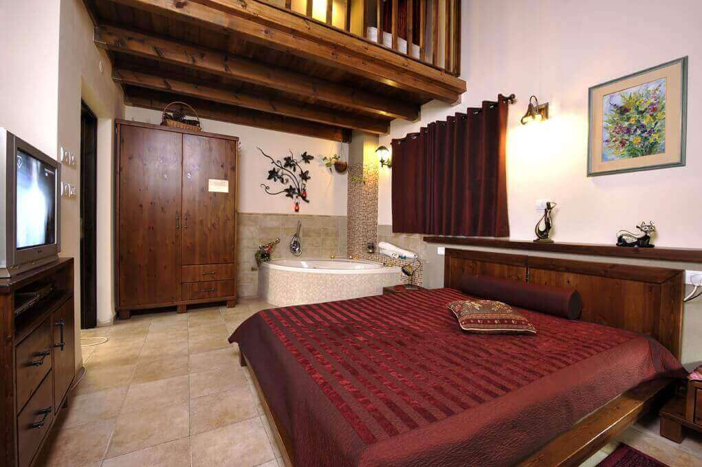 חדר שינה עם מיטה זוגית נוחה, מיטה זוגית נוספת, קומת גלריה עם 2 מיטות יחיד, ג'קוזי זרמים, פינת ישיבה עם טלוויזיה עם חיבור לערוצי כבלים