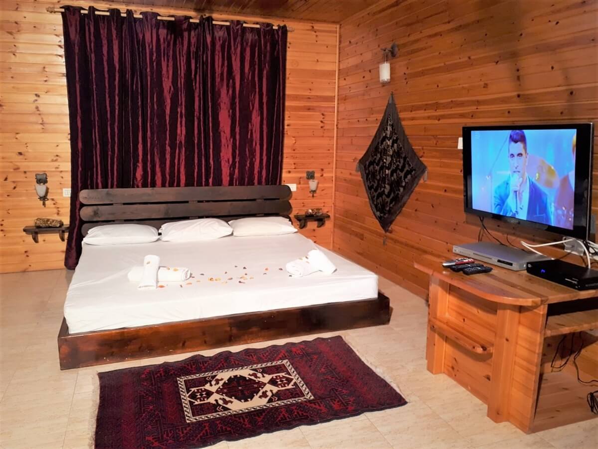מיטה זוגית ענקית (2x2), ג'קוזי מפנק, מיזוג אוויר, מסך טלוויזיה lcd בחיבור לכבלים, חדר רחצה עם מגבות ותמרוקים ומטבחון הכולל את כל הדרוש לאירוח שלכם - מקרר, מיקרוגל, כיריים חשמליות, פלטה לשבת, כלי אוכל, כלי הגשה ופינת קפה מאובזרת. לכל בקתה מרפסת פרטית ומקורה המשקיפה לבריכה עם עמדת מנגל (לא בשבת).