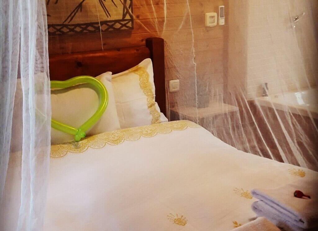 בקתות העץ בעלות 3 חללים - חדר שינה, סלון וגלריה לשינה המיועדת ל-2 אורחים נוספים. ישנם גם לולים עבור הבאים עם תינוקות.