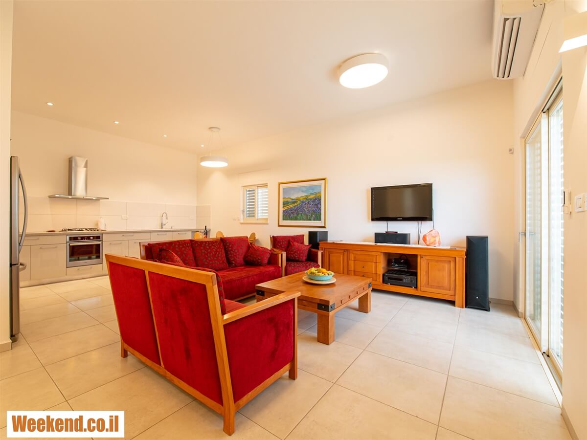יחידת הנופש ממוזגת, מרוווחת במיוחד (95 מ"ר) ומתאימה לאירוח זוגות או משפחות, עד 7 נופשים שייהנו מ-2 חדרי שינה נעימים, חדר רחצה עם סט תחליבים ומגבות נקיות, סלון מרכזי עם מערכת ישיבה גדולה, טלוויזיה בכבלים וחלון פנורמי שמוביל לחצר הירוקה, וגם מטבח גדול שמאובזר לנוחות מקסימלית עם פינת אוכל משפחתית, תנור אפיה, כיריים, מיקרוגל, מצנם, פינת קפה ותה, סכו"ם, מקרר וכלי הגשה.