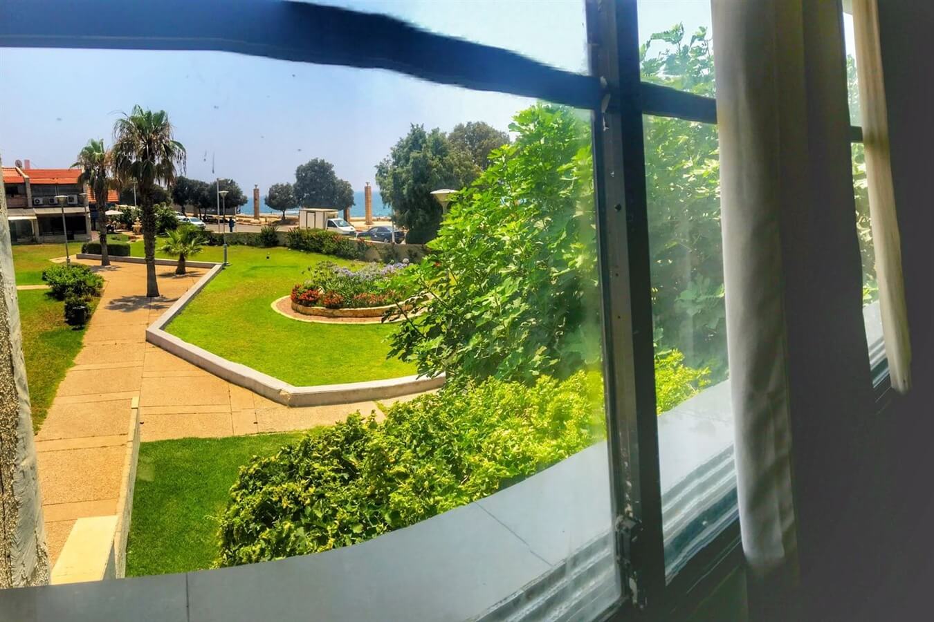 מרפסת פרטית למול גינה ירוקה וים כחול
