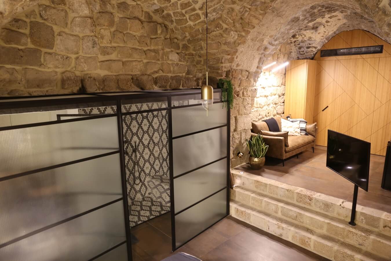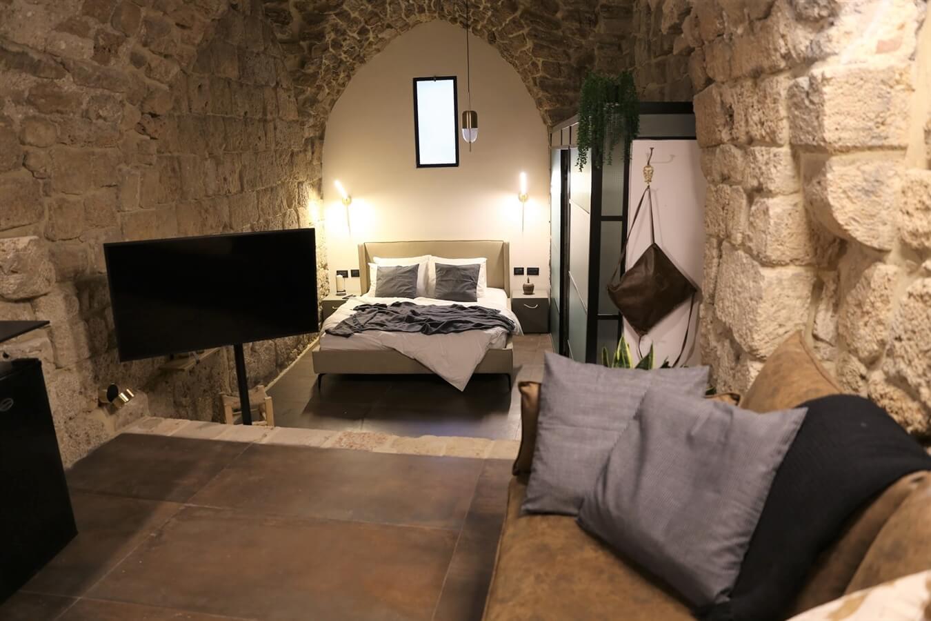 ביחידה שילוב הרמוני של עבודת אבן, נגרות, מסגרות ופרטי ריהוט איכותיים, בקו עיצוב מינימליסטי ששומר על צביונו ההיסטורי של המקום.