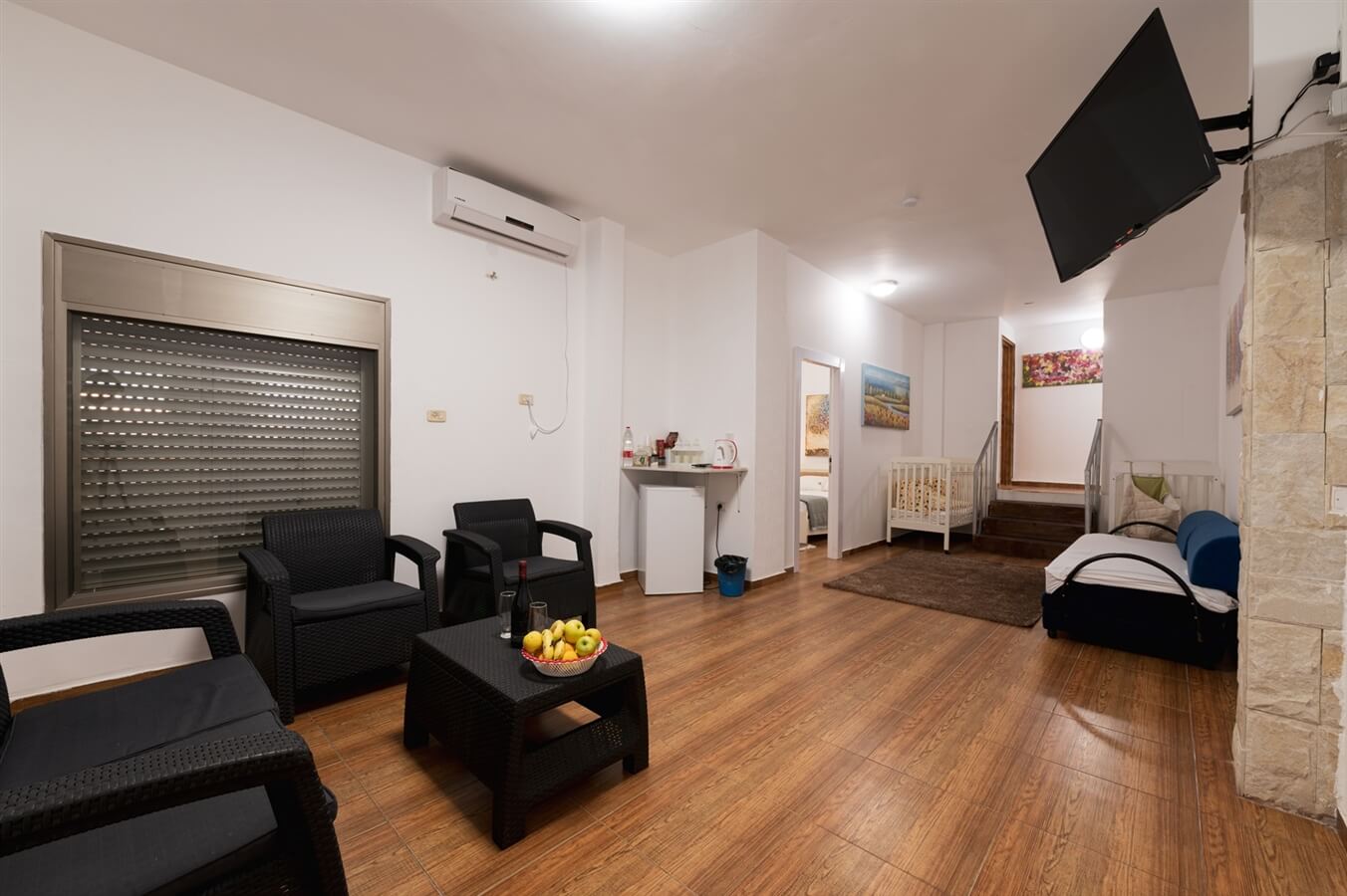 - סלון הכולל טלוויזיה בכבלים וספה נפתחת