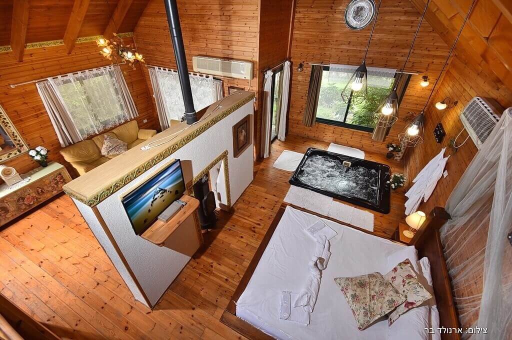 - קומה תחתונה המופרדת במחיצה וכוללת מיטה זוגית, ג'קוזי ספא גדול, ספה נפתחת, טלוויזיה בחיבור ליס לכל צד