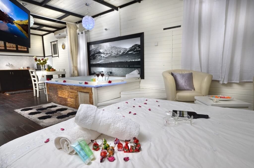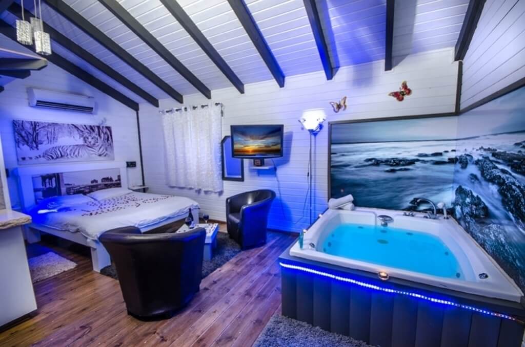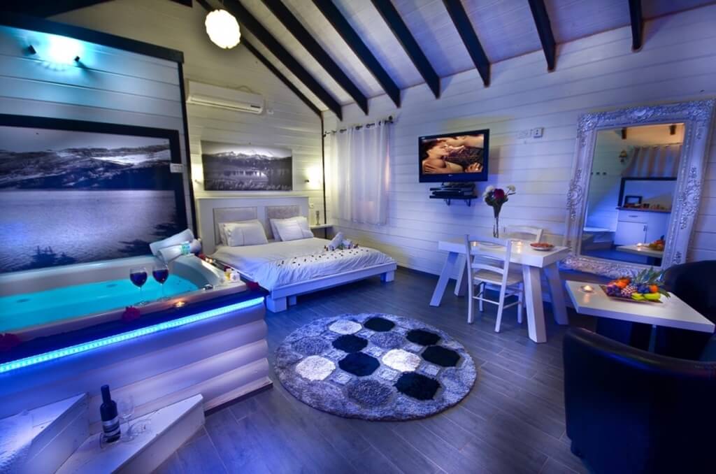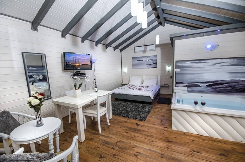 בבקתה ג'קוזי זרמים עם תאורה לילית רומנטית, מיטה זוגית, פינת אוכל, מטבחון, פינת ישיבה, מערכת קולנוע ביתית, פינת ישיבה ויציאה למרפסת פאטיו מקסימה. לנוחיותכם המטבחון מאובזר במיקרוגל, כיריים חשמליות, מקרר וערכת קפה.