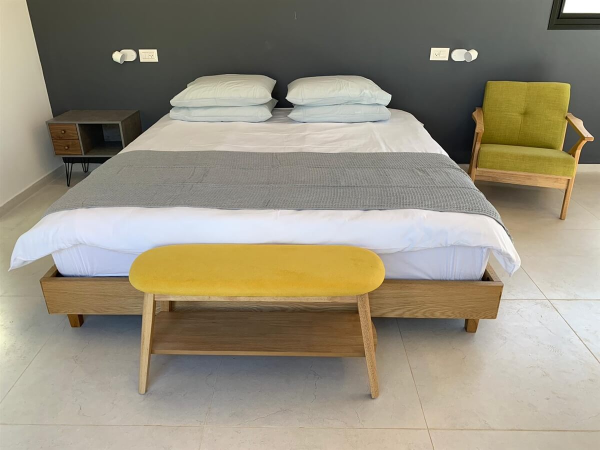 בקתות 1+2 – 2 יחידות זהות בעיצוב הדום קטיפה בגוון צהוב, המתאימות לאירוח של עד 5 נפשות, וכוללות:
