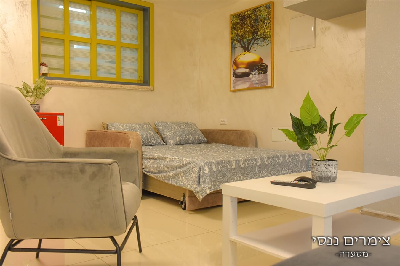 - סלון עם מערכת ישיבה נוחה, ספה הנפתחת למיטה זוגית וטלוויזיה חכמה עם כבלים