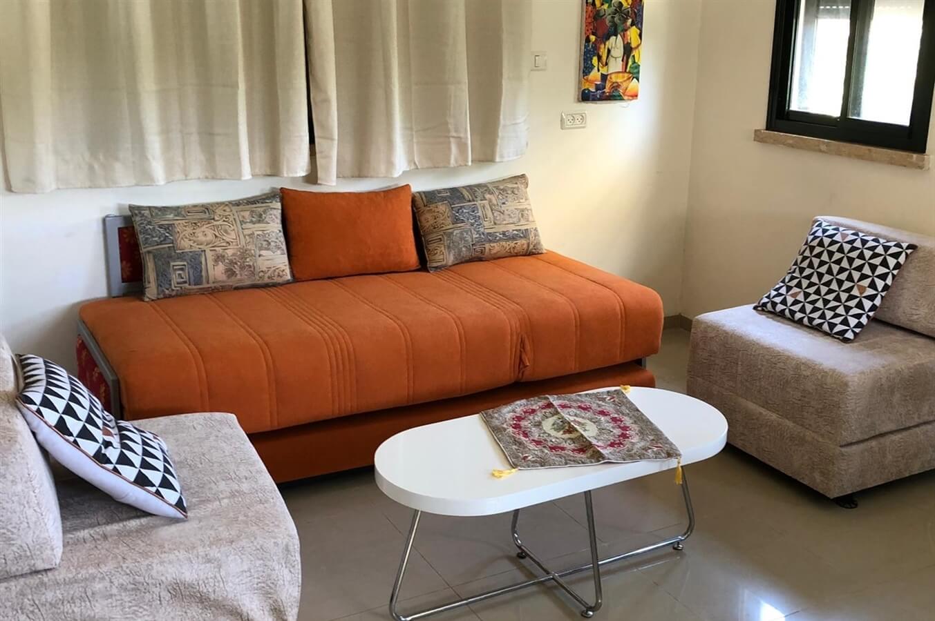 - סלון בו ספת ישיבה הנפתחת למיטה זוגית, 2 כורסאות הנפתחות למיטה יחיד כל אחת ומסך טלוויזיה בחיבור ללווין.