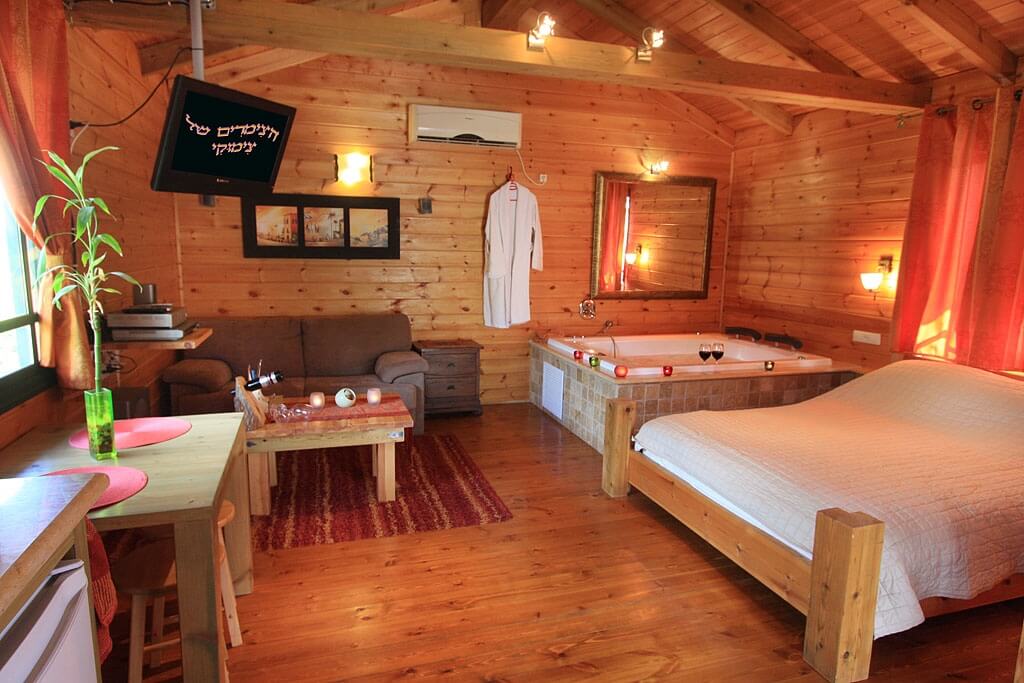 בקתות עץ כפריות עם ג'קוזי ומרפסת פטיו - במקום תמצאו 2 בקתות עץ רומנטיות שבכל אחת מהן: